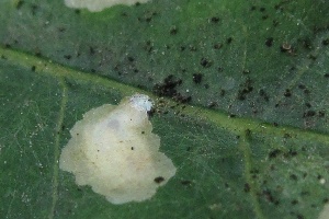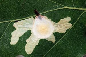 1-2: Blattoberseite mit Exuvie und Blattunterseite, Deutschland, Rheinland-Pfalz, Ober-Olmer Wald bei Mainz, Eiche an einem Wegsaum auf einer Waldlichtung, 17. Oktober 2005 (Freilandfotos: Jürgen Rodeland), conf. Rudolf BrynerForum