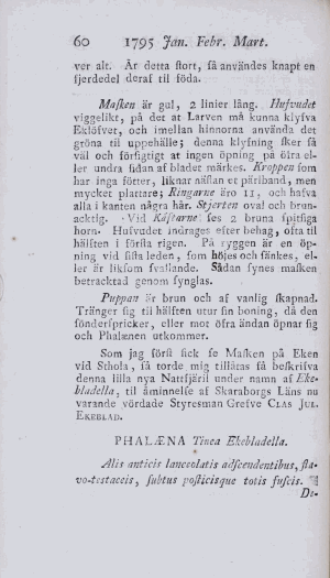 - Erstbeschreibung: Bjerkander, C. (1795): Phalæna Ekebladella En ny Nattfjäril beskrifven. — Kongl. vetenskaps academiens nya handlingar 16: 58-63, pl. II. Stockholm (Johan Pehr Lindh).