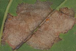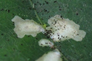 12-14: junge Minen mit Kotauswurf (vom Einfressen in das Blatt stammend) und Eihüllen, Deutschland, Niedersachsen, Stadtteil Vahrenheide, Kugelfangtrift (bodensaurer Magerrasen), 50 m, 23. Juli 2020 (det. & Freilandfotos: Tina Schulz)