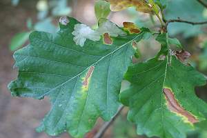 11: drei verschmolzene Minen an Quercus cf. rubra (Roteiche): Deutschland, Niedersachsen, Stadt Hannover, Stadtteil Wülferode, Bockmerholz (Eichen-Hainbuchen-Buchenwald), Nähe Autobahn 7, 80 m, stark beschattetes sehr junges Bäumchen ohne Zukunft, 21. August 2017 (det. & Freilandfoto: Tina Schulz)