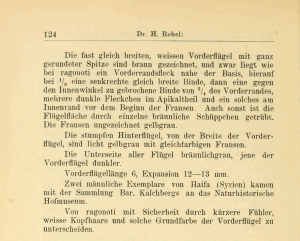 - Erstbeschreibung: Rebel, H. (1902-1903): Neue Pyraliden, Pterophoriden und Tineen des palaearctischen Faunengebietes. — Deutsche Entomologische Zeitschrift Iris 15 (1): 100-126, (2) pl. IV. Dresden-Blasewitz (Elbgau-Buchdruckerei und Verlagsanstalt).