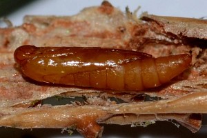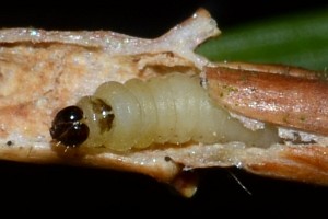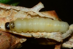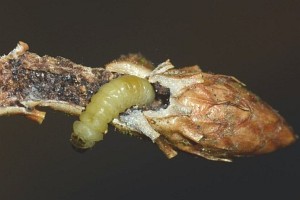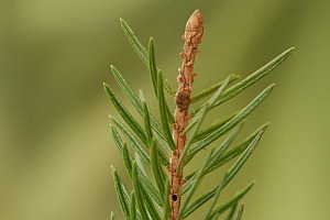 Die raupe lebt in den Zweigspitzen jüngerer Bäume der Fichte.