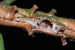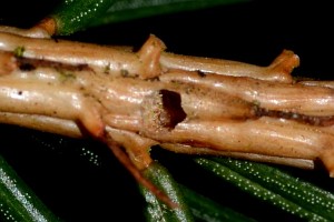 Die Raupe überwintert in den Zweigspitzen von jungen und alten Fichten (Picea abies). An befallenen Zweigspitzen (es werden auch die Knospen ausgefressen) vergilben die Nadeln auf einer Länge von 1 – 5 cm, fallen später ab. Am unteren Ende des Fraßgangs findet sich meist das von der Raupe ausgefressene kreisrunde Schlupfloch (bei Argyresthia bergiella oval).