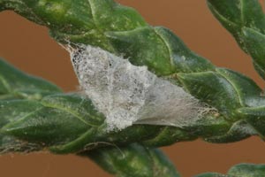 Auf UKmoths [Artseite auf UKmoths.org.uk] ist zu lesen: "The larvae feed on cypress (Chamaecyparis and Cupressocyparis) and juniper (Juniperus), feeding internally on the leaves and young shoots. In spring affected shoots turn brown and are quite noticeable." Auf [ukflymines.co.uk] wird Cuprocyparis leylandii angeführt mit Erläuterung: "pers. comm. Ben Smart". Die Angaben zu Cupressus sp. und Thuja sp. erscheinen mir hinsichtlich der Pflanzenbestimmung unsicher.