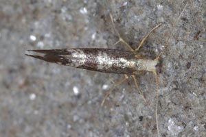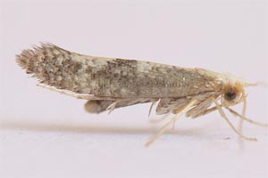 - Argyresthia conjugella (veilchenbraune Färbung mit feiner, heller Rieselung; Vorderrand mit dunklem Fleck)