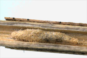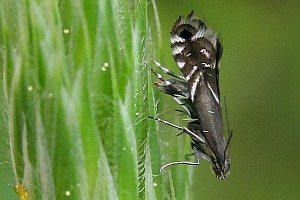 1: Blütenstand von Gewöhnlichem Knäulgras (Dactylis glomerata) mit ♀ bei Eiablage: Deutschland, Niedersachsen, Deister, Umgebung Barsinghausen, große zusammenhängende Lichtungsbereiche mit Aufforstung, 140 m, 12. Mai 2015 (det. & Freilandfoto: Tina Schulz)Forum