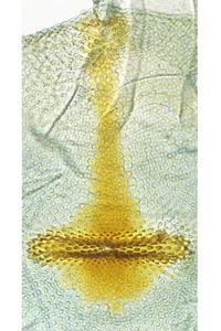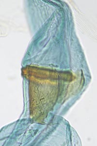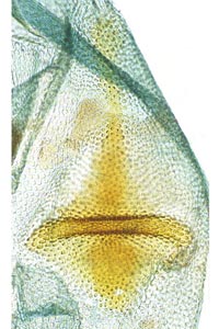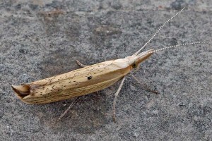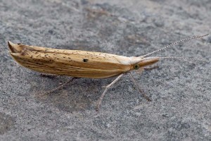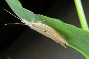 Erkennbar an der charakteristischen Flügelform und der strohgelben Flügelfärbung mit den auffallenden schwarzen Fleckchen unterhalb der Flügelmitte. (Text: Rudolf Bryner)