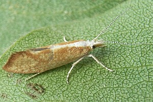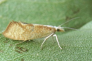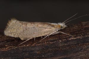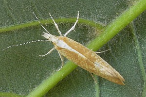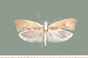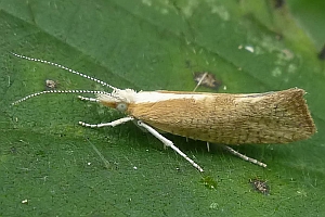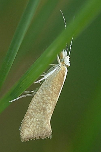 Hell strohgelbe Art mit dunklerem Gittermuster und auffallend weißem Kopf und Thorax. Dunklere Querbänder auf den Vorderflügeln, wie sie die folgenden, ähnlichen Arten besitzen, fehlen. (Text: Rudolf Bryner)