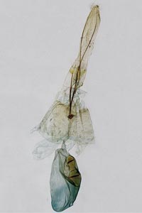 4: Verpuppungsgespinst, Deutschland, Sachsen, Dübener Heide, Umgebung von Doberschütz, Mischwald, leg. Raupe 2. Mai 2009, 10. Mai 2009 (Foto: Heidrun Melzer), cult. & det. Heidrun Melzer