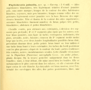 Mey (2006: 130) legt einen Lecottypus fest: "Lectotype ♂ [here designated]: “harmel/Diled/2. 4. [19]07” [handwritten with ink on white paper], “TYPE” [printed on red card], “thymelea/30. 4. [19]07” [handwritten with ink on white paper], “jedmella” [handwritten with ink on white paper], genitalia slide 556a, J. Klimesch (MNHN). Paralectotypes. 1 ♀, same data as lectotype, genitalia slide 557a, J. Klimesch (MNHN). 2 [mm], 1 ♀, “Thymelaea/ microphylla/2. 4. [19]07”, “Phyllobrostis/jedmella”, “BseF 1907, 307” (MNHN)".