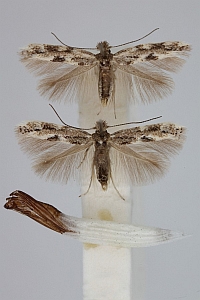 "Die Art fliegt in unserer Gegend (nördliche Kalkalpen) in der ersten August-Hälfte auf warmen Felsstandorten und überwachsenen Geröllhalden. Die Raupe lebt vom Spätsommer an zuerst in Minen in den filzigen Blättern von Achillea clavennae. Diese verlaufen überwiegend entlang des Blattrandes und sind auf Grund der Behaarung der Blätter kaum zu erkennen. Nach der Überwinterung lebt die Raupe noch eine Zeit in der Mine und verrät sich nur durch fallweisen Kotauswurf. Später verlässt sie die Mine und lebt frei an den Blättern (meist an der Unterseite). Die alten Jugendminen verfärben sich graubraun und befallene Pflanzen im Biotop sind mit etwas Übung zu erkennen und die Raupensuche damit erfolgversprechender. Der Falter kommt auch regelmässig ans Licht." [Text: [Norbert Pöll]]