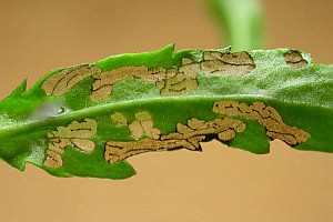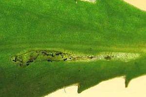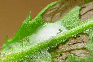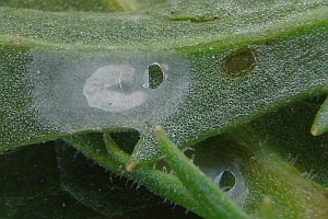 1-2: oberes Blatt von Margerite (Leucanthemum vulgare) mit Fensterfraß, Ober- und Unterseite (an der Unterseite befindet sich links ein Häutungskokon): Deutschland, Thüringen, Langenfeld, Garten, 14. Mai 2012 (Fotos: Uwe Büchner)Forum
