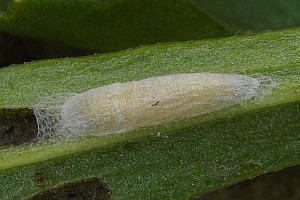 2: kaum gerippter Verpuppungskokon, Deutschland, Sachsen, Oberholz bei Leipzig, Wiese am Waldrand, Raupen an Margerite (Leucanthemum vulgare) 20. Juni 2014 (leg., cult., det. & Foto am 30. Juni 2014: Heidrun Melzer)Forum