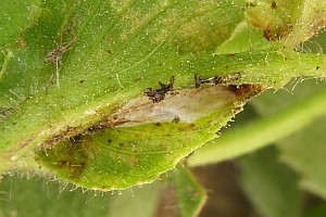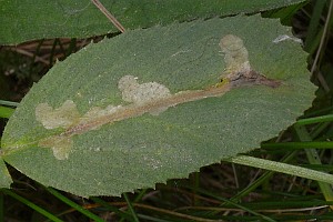 7-9: drei erst kürzlich von der Raupe verlassene Minen an Hauhechel (Ononis repens): Deutschland, Thüringen, Umgeb. von Leutra bei Jena, sonnige Lichtung am Waldrand, 12. Juli 2014 (leg., cult., det. & Fotos: Heidrun Melzer)Forum