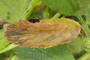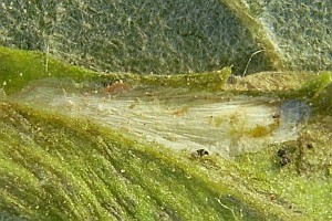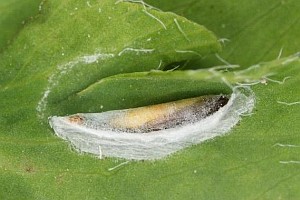 7: Kokon an Blattunterseite, Deutschland, Thüringen, Jena-Göschwitz, Langtal, ca. 330 m, Minen in Blättern von Hauhechel (Ononis repens), 21. Juni 2011 (leg., cult., det. & Foto am 27. Juni 2011: Heidrun Melzer)