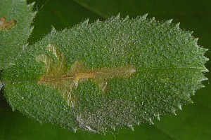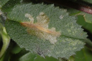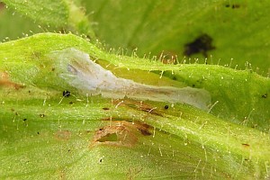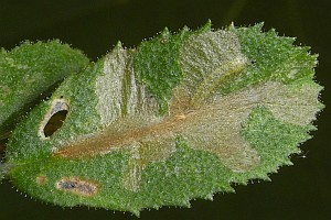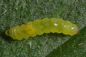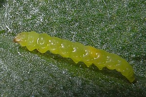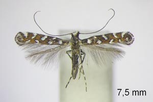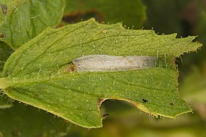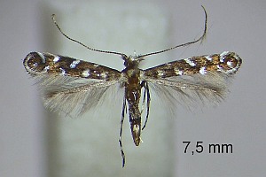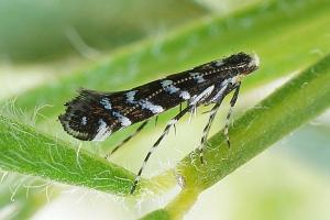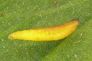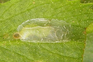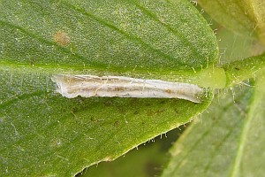 2: 3 mm lang, Deutschland, Thüringen, Jena-Göschwitz, Langtal, ca. 330 m, Raupe 21. Juni 2011 minierend in Blatt von Hauhechel (Ononis repens), e.l. 10. Juli 2011 (leg., cult., det. & Foto: Heidrun Melzer)Forum
