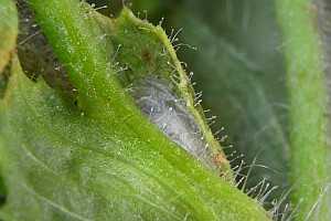 5-6: Kokons an Blattunterseite, Deutschland, Thüringen, Umgeb. von Leutra bei Jena, sonnige Lichtung am Waldrand, an Kriechender Hauhechel (Ononis repens), 12. Juli 2014 (Fotos: Heidrun Melzer) [Forum 1-6]