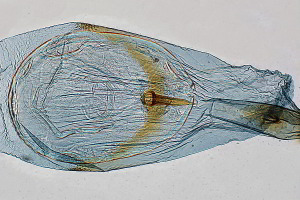 1-2: ♀, Deutschland, Baden-Württemberg, 78176 Blumberg, Ortsrandlage, Südhang, in Waldnähe (Buchen-Mischwald, Waldrand mit anschließendem Trespen-Halbtrockenrasen auf Kalk), 720 m, am Licht, 28. April 2012 (leg., gen. det. & Foto: Hans-Peter Deuring). Das Oval, das die Bursa fast ausfüllt, dürfte eine Spermatophore sein.Forum