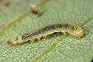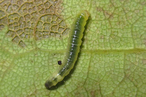 5: ausgewachsene Raupe, Deutschland, Niedersachsen, Bad Nenndorf, 80 m, Gewerbegebiet nahe der A2, Piepmühle, Blattrollen mit Raupen 24. Juli 2018 an jungem Acer pseudoplatanus (Berg-Ahorn), Zuchtfoto 29. Juli 2018 (cult., det. & fot.: Tina Schulz)