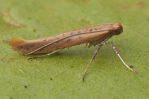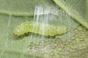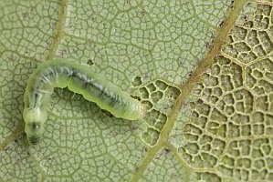 1: verpuppungsreife Raupe (oben) auf der Blattunterseite von Acer opalus gemeinsam mit einer Raupe von Carcina quercana (unten): Schweiz, Neuchâtel, Le Landeron, 710 m, 20. Juli 2008 (manipulierte Freilandaufnahme: Rudolf Bryner), cult. & det. Rudolf BrynerForum