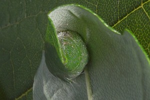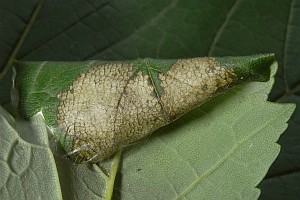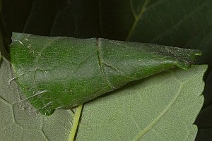 3: Verpuppungsgespinst in Blattkegel, Deutschland, Thüringen, Gespringwiesen bei Schmalkalden, leg. Raupe an Bergahorn (Acer pseudoplatanus), e.l. 30. September 2006 (Foto: Uwe Büchner), cult. & det. Uwe Büchner