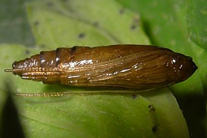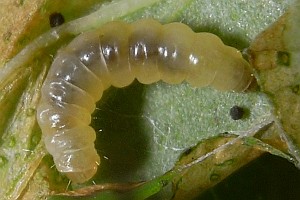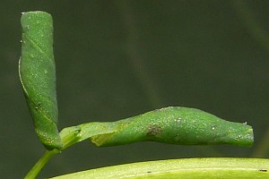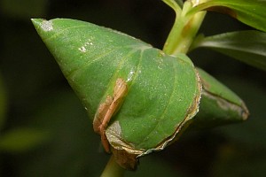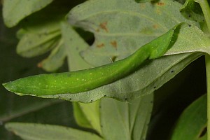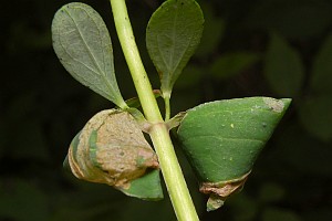 7: Blattröllchen (Verpuppungsgehäuse), Deutschland, Sachsen, Doberschütz, Waldweg mit kräuterreicher Randvegetation, an Johanniskraut (Hypericum spec.), 7. Juni 2009 (Foto: Heidrun Melzer), det. Heidrun MelzerForum