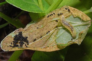 5-6: Blattkegel (Behausung der erwachsenen Raupe), Deutschland, Sachsen, Doberschütz, Waldweg mit kräuterreicher Randvegetation, an Johanniskraut (Hypericum spec.), 5. Juni 2009 (Freilandfotos: Heidrun Melzer), leg., cult. & det. Heidrun MelzerForum