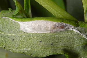 3-4: Verpuppungsgespinst unter Blattumschlag an Johanniskraut (Hypericum spec.): Fundortdaten wie [1-2], 20. Juni 2009 (Freilandfotos, [3] manipuliert: Heidrun Melzer), leg., cult. & det. Heidrun MelzerForum