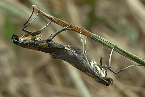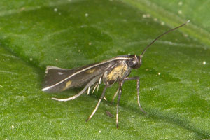 Mine: Typische Gracillariidae-Faltenmine, Falten an der unteren Epidermis. Einzige Art der Familie, die im frühen Larvalstadium minierend an Johanniskraut (Hypericum sp.) lebt.