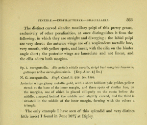 - Stainton, H. T. (1864): The natural history of the Tineina 8: I-IX, 1-315, Gracilaria pl. I-V, Ornix pl. I-III. London (John van Voorst) – Paris (Deyrolle) – Berlin (E. S. Mittler und Sohn). — Digitalisat auf archive.org: [138-149], [Gracilaria pl. IV fig. 1].