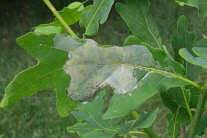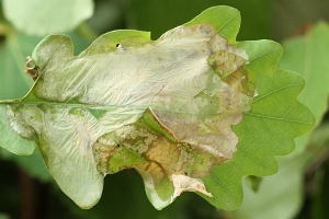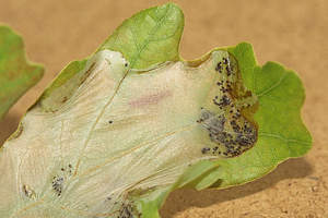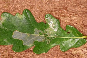 3: Deutschland, Sachsen, Dübener Heide, Umgebung von Doberschütz, Blasenminen an Blättern junger Eichen (Quercus robur) am 14. Mai 2011, e.l. 2. Juni 2011 (leg., cult., det. und Studiofoto: Heidrun Melzer)