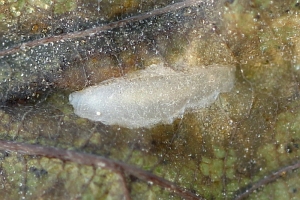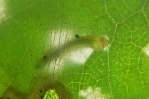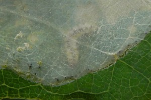 1: in geöffneter Mine, Deutschland, Sachsen, Dübener Heide, Umgebung von Doberschütz, Blasenminen an Blättern junger Eichen (Quercus robur), 14. Mai 2011 (leg., cult., det. und Foto: Heidrun Melzer)