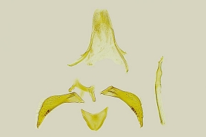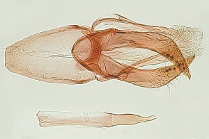 3: Österreich, Niederösterreich, Neunkirchen Umgebung, Anfang Mai 2024 (leg. Johann Stückler, Genitalpräparation, Mikrofoto & det.: Peter Buchner) Die Valven sind, verglichen mit anderen Phyllonorycter ssp. ungewöhnlich stark sklerotisiert und lassen sich nicht ohne Weiteres in die Standard-Position bringen. Daher wurde hier darauf verzichtet, u.a. deshalb, weil anzunehmen ist, dass auch andere Präparatoren darauf verzichten und das hier gebotene Bild dem Endstadium solcher Präparate entspricht. Unabhängig davon wurde das Bild um 90 Grad gedreht, um das vorgegebene Format besser auszunützen