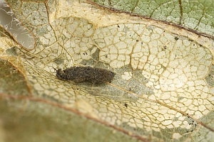 1: geöffnete Mine mit leerem Puppenkokon: Österreich, Wien, Pötzleinsdorf, leg. Puppe in Mine an Zerr-Eiche (Quercus cerris) 23. Juni 2020, e.p. 1. Juli 2020 (leg., cult, det. & Foto: Peter Buchner) Bis 1. August 2020 fehlbestimmt unter Phyllonorycter mannii eingestellt, Bestimmungskorrektur nach Schlupf eine weiteren Falters