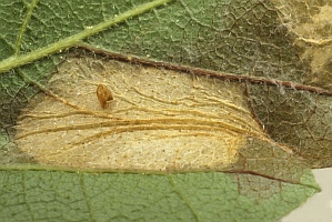 1: Mine mit Exuvie: Österreich, Wien, Pötzleinsdorf, leg. Puppe in Mine an Zerr-Eiche (Quercus cerris) 23. Juni 2020, e.p. 1. Juli 2020 (leg., cult, det. & Foto: Peter Buchner) Bis 1. August 2020 fehlbestimmt unter Phyllonorycter mannii eingestellt, Bestimmungskorrektur nach Schlupf eine weiteren Falters