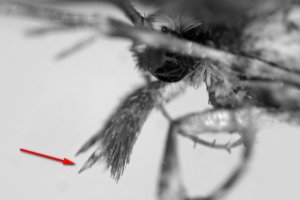 - "Endglied kürzer als das Mittelglied, durch Schuppen verdickt und mit dunklem Ring": Tatsächlich erschien es mir nicht deutlich kürzer. Weder die Verdickung noch der dunkle Ring sind mir besonders aufgefallen.