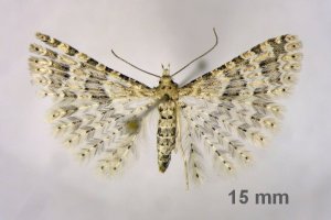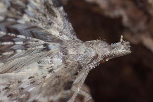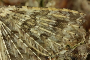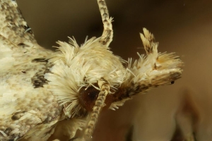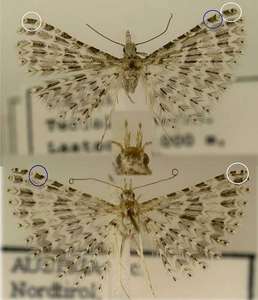 - "Subterminalbinde auf Feder 1 mit zwei Flecken beginnend" (weißer Kreis): Ein Tier von insgesamt 5 Belegen wich in diesem Merkmal ab: im rechten Flügel gerade noch als geteilt erkennbar, war links eindeutig nur ein Fleck! (oberes Bild) Dieser reicht hier allerdings weit Richtung Apex. Ob das für solche Sonderfälle ein brauchbares Mittel ist, um Alucita hexadactyla abzutrennen (wo dieser eine Fleck vom Apex weiter abgerückt ist) müsste an umfangreicherem Material geprüft werden.