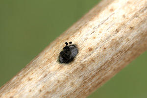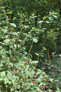 Befallen werden ausschliesslich die im Verlauf des Frühlings und Frühsommers in die Höhe geschossenen Jungzweige des Busches, wie sie im Bild zu sehen sind. In älteren Zweigen kann man die jetzt leeren Befallsstellen früherer Jahre finden. (Rudolf Bryner)