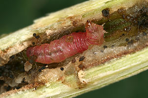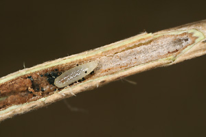 Die Anwesenheit einer Raupe verrät sich in den Jungzweigen durch eine sanfte Verdickung (Bild 1). Manchmal ist diese leichter zu erspüren als zu sehen. Sehr feiner Kotauswurf durch ein kleines Loch am unteren Ende der Zweiganschwellung (Bild 2) ist ein weiterer Hinweis auf den Bewohner. Die Raupe lebt im Mark des Zweiges in einem Gang, der etwa die Länge der Verdickung hat und mit Gespinst und Kot ausgefüllt ist (Bild 3). Die Auswurflöcher sind entweder unverschlossen oder, wie im Bild 4, mit einem feinen Gespinstdeckel versehen. (Rudolf Bryner)