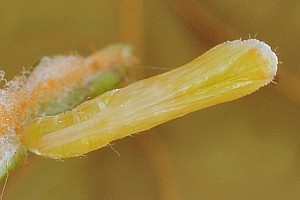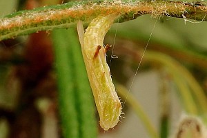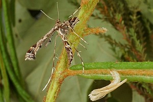 Zeller (1852: 340) meldete: "Die Raupe fand ich am 20. Juli 1846 an einem grossblüthigen Pelargonium, das ich eben erst aus einem Garten erhalten hatte. Sie sass an einem Blüthenstiele, wo sie zwei Blüthenknospen von der Seite her, durch die Kelchblätter hindurch, angebohrt und dann Theile der Krone, vorzüglich aber die Staubgefässe gefressen hatte; die eine dieser Blüthenknospen öffnete sich nach ein paar Tagen, die andere verkümmerte. Da ich die unteren Blätter der Pflanze hier und da in der Fläche durchlöchert sah, so vermuthete ich, dass diese Beschädigungen von der Pterophorusraupe herrührten; allein zuletzt fand ich unter einem Blatte eine kleine Gammaraupe. Ich weiss also nicht, ob Acanthodact. auch Blätter befrisst. — Da die Raupe mir nicht erwachsen schien, so mochte ich sie nicht sehr stören und untersuchte sie daher nicht genau. Sie war fast 7''' lang, stelzenfüssig, hellgrün mit reichlichen, farblosen Knotenhärchen und reichlichen, hellen, gekrümmten, nicht sehr langen Borsten (deren Stellung ich nicht beobachtet habe). Kopf klar, gelblich mit dunklem Gebiss. Ueber den Rücken zwei weissliche Längslinien, darunter in nicht grossem Abstände je eine Kappenlinie (linea repanda), deren Convexitäten nach oben gerichtet sind. — Gestört kroch sie umher und nahm nach einigen Stunden ihren Platz an der untern Seite eines Blattstiels. Am folgenden Tage hatte sie die Stelle besponnen, ein Zeichen, dass sie sich verpuppen wollte. Am dritten Tage Vormittags sah ich die Verpuppung mit an. Die Raupe war überall blasser und in den drei Brustringen dicker geworden, und zeigte eine fortwährende schwache Bewegung. Den Moment der Sprengung der Raupenhaut versäumte ich; aber ich sah noch, wie die Puppe die Haut am Hinterleibe nach und nach zurückschob. An einen Faden war bei ihr so wenig zu denken, wie bei einem andern Pterophorus. Zuletzt hing sie bloss in der Haut, also frei, bis sie mit dem Cremaster zugriff und sich einhäkelte. Die Haut war noch unter ihr und hinderte sie, sich mit den Bauchhäkchen anzuhängen. Nach einigen Stunden, als sie härter geworden war, suchte ich die Haut zu entfernen, wegen dieser Störung schlug sie den Vorderkörper zurück, drehte sich etwas, und plötzlich hing sie auch mit den Bauchhäkchen in der Seide."