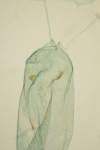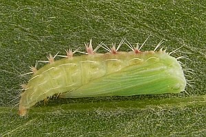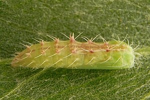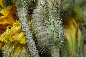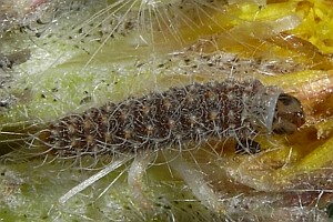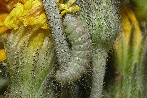 Heidrun Melzer fand ihre Raupe in Sachsen in einer Blüte des Kleinen Habichtskrauts (Hieracium pilosella).