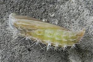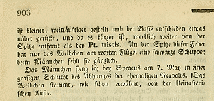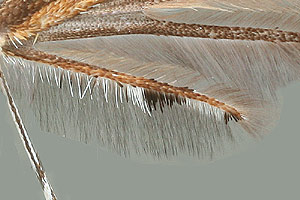 Merkmale: schwarze Randbeschuppung der letzten Hinterflügelfeder am Vorderrand fehlend, am Hinterrand bei zwei Drittel der Länge einen Schuppenzahn bildend, die Federspitze mit mehreren nach unten weisenden schwarzen Schuppen. Text: Rudolf Bryner.