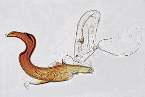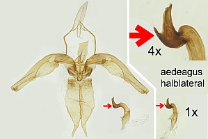 5: ♂, Österreich, Niederösterreich, Hochberg bei Perchtoldsdorf, 300 m, 20. August 2021 (leg., Präparation, Mikrofoto & det.: Peter Buchner) Die Einschübe rechts zeigen den Aedeagus in halblateraler Lage, so wird der seitlich abstehende Dorn deutlich sichtbar. In der üblichen strikt lateralen Ansicht (Einschub links unten) ist er höchstens in Form einer diffusen Verdunkelung erkennbar (roter Pfeil)
