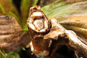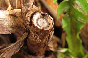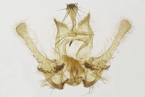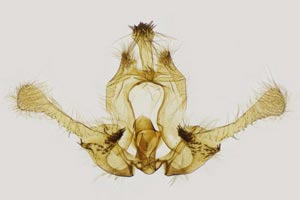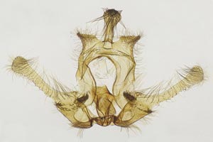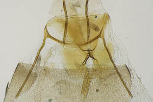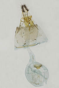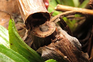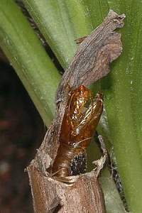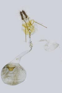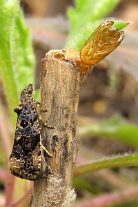 Die Raupen sind zum Zeitpunkt, da die Pflanzen (Digitalis lutea) neue Triebe ausbilden, erwachsen. Die Verpuppung erfolgt oft in einem letztjährigen Blütenstengel. Wenn dieser abgebrochen ist, so wird die Bruchstelle von der Raupe verschlossen. Die Puppe stösst den runden Verschluss wie einen Schachtdeckel nach oben auf. Die Aufnahme 4 (oben) zeigt eine solche Exuvie. Ist der letztjährige Blütenstengel nicht abgebrochen, so erfolgt der Schlupf durch ein seitlich am Stengel angefertigtes Schlupfloch. (Autor: [Rudolf Bryner])