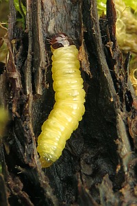 Kennel (1913: 384-385) hatte geschrieben: "Die Raupe ist gelblichweiß mit dunkleren Wärzchen, Kopf und Nackenschild sind braun; sie lebt vom Herbst bis Ende April in Stengel und Wurzel von Digitalis ambigua." Und Schütze (1931: 173) meldete: "In Stängeln von Digitalis ambigua (Eppelsheim), Mühlig fand sie in der Wurzel, sie beginnt ihren Fraß am Wurzelhalse, gräbt sich immer tiefer hinab, steigt wieder aufwärts bis zum Eingang und erweitert diesen derart, dass der Stängel bricht. Die Öffnung verschließt sie mit Gespinst und verwandelt sich im April in dem Raume (Kaltenbach)."
