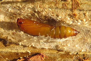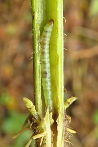 Kennel (1913: 392) hatte gemeldet: "Die Raupe ist gelblich, der Kopf hellbraun, das Nackenschild etwas dunkler als der Körper. Sie lebt im Herbst abwärts bohrend im Stengel von Stachys sylvestris, überwintert in den Wurzeln und steigt im Frühling wieder aufwärts; sie verwandelt sich im oberen Stengelteil oder im trockenen Blütenstiel anfangs Mai".