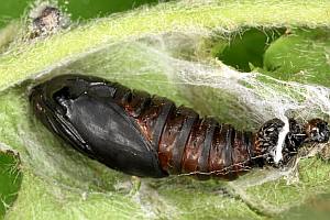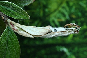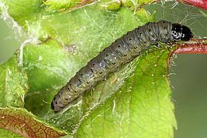 Die Raupe lebt vor allem an Weißdorn, ebenso Schlehe und Wild-Kirsche, aber auch an Eberesche, Apfel und Birne, wo sie zwischen zusammengesponnenen Blättern zu finden ist. Die in der Literatur genannte Cotoneaster sp. wird durch einen Raupenfund von Franziska Bauer in Dresden bestätigt (s.o.), außerdem meldet Schmid (2019: 598-599), dass er die Raupe in der subalpinen Stufe der Schweiz an Cotoneaster integerrimus fand.
