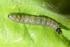 Kennel (1913: 380) listete unter dem Namen "Argyroploce variegana Hb." auf: "Die Raupe ist grünlichgrau bis dunkel olivgrün mit schwarzen Wärzchen, Kopf und Nackenschild sind schwarzbraun bis schwarz, die Analklappe ist schwärzlich; sie lebt im April und Mai polyphag zwischen versponnenen Blüten, Blattknospen und später Blättern von Crataegus, Pyrus malus und communis, Sorbus aucuparia, Prunus avium, Betula, Myrica gale, Quercus."