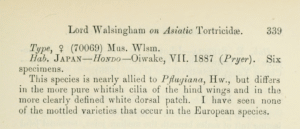 - Erstbeschreibung: Walsingham (1900): Asiatic Tortricidae. — The Annals and Magazine of Natural History, Including Zoology, Botany, and Geology. Seventh series 6: 121-137, 234-243, 333-341, 401-409, 430-448. London (Taylor and Francis).