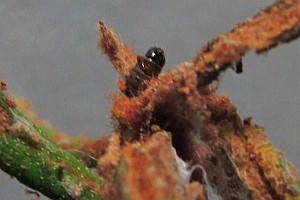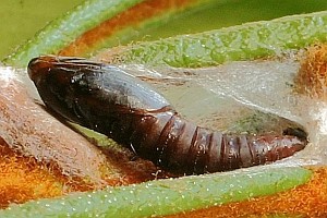 Die Raupe dieses Falters kann man in einer frostfreien Zeit noch mitten im Winter an Sumpf-Porst (Ledum palustre) finden. Sie entwickelt sich im Frühjahr rasch und die Puppe entlässt bald den Schmetterling. [Friedmar Graf]